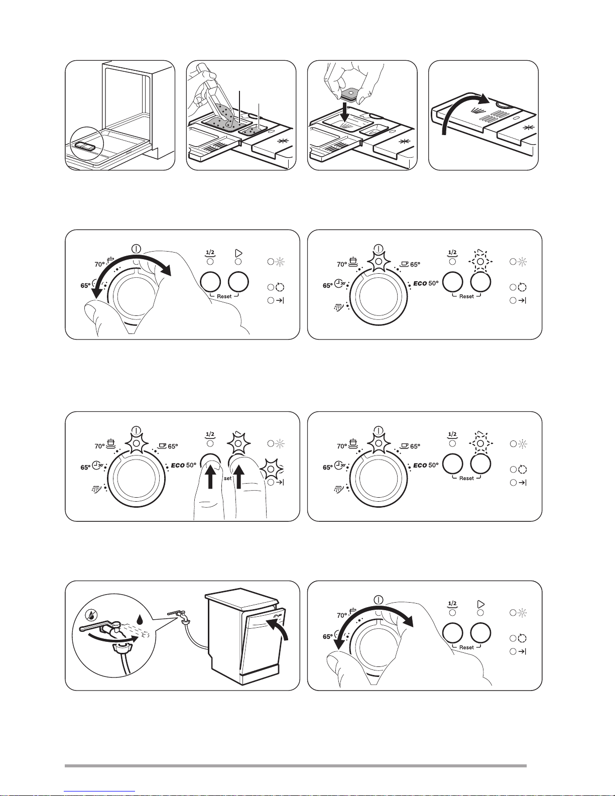• Only use rinse aid and detergent for dishwasher.