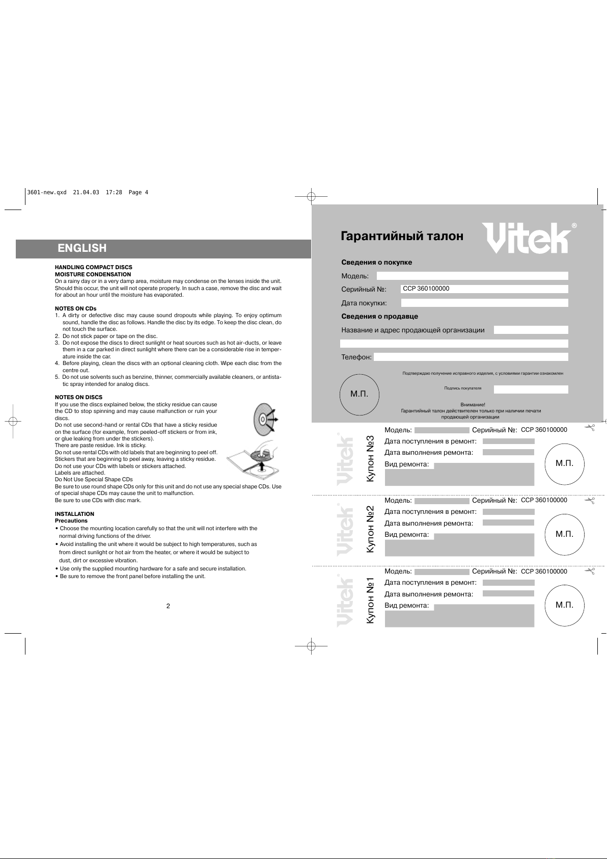 компакт&диск в проигрыватель таким образом, чтобы рабочая сторона компакт&диска
